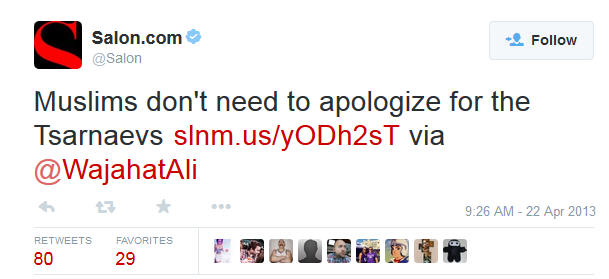 The Tsarnaev brothers’ criminal and perverse actions do not speak for me or the overwhelming majority of Muslims. I am not compelled to apologize for them or explain their actions. Muslims are not a monolithic, Borg-like collective ... with a telepathic understanding of the perverse mind-set of radicals in their “community.” When the dreaded D.C. sniper turned out to be two Nation of Islam black Muslims who admired bin Laden and planned to 'kill six white people a day' because 'the white man is the devil,' leaders were quick to call for caution: