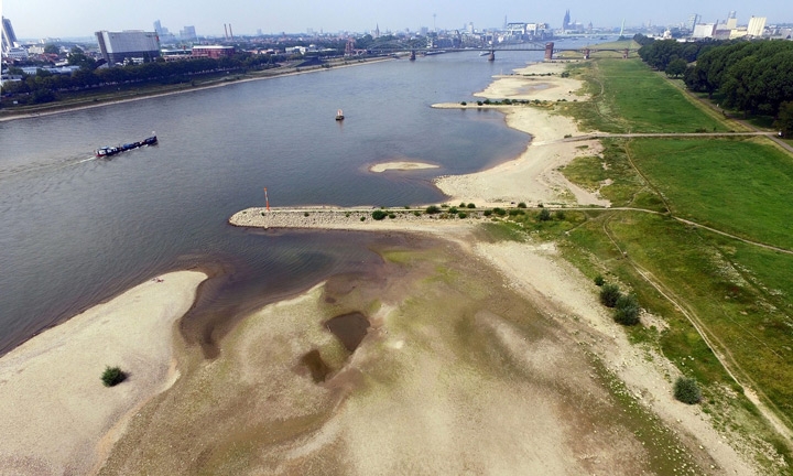 An aerial view shows dried out areas of the Rhine river in Cologne, Germany.