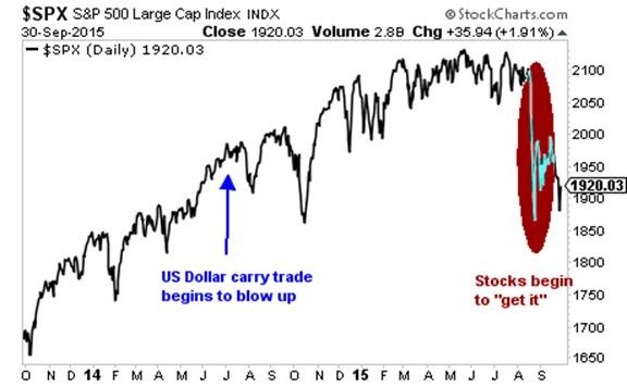To: Goose94 who wrote (14420 ) 10/1/2015 3:18:59 PM From: Goose94 Read Replies (1) | Respond to of 202720 Stocks Are FINALLY Beginning To Understand The Currency Crisis One of the biggest issues investors need to assess today is the US Dollar carry trade. If you’re unfamiliar with the concept of a carry trade, it occurs when you borrow in one currency, usually at a very low interest rate, and then invest the money in another security, whether it be a bond, stock or what have you, that is denominated in another currency. More often than not, you invest directly in the other currency itself, pocketing the difference in interest rates. So if the US Dollar pays 0.25% and the Yuan offers 5% for example, you borrow Dollars and invest in Yuan and pocket the 4.75% difference. Now, investors in currencies are permitted to use greater leverage than their counterparts in stocks or bonds. Whereas a stock investor might be permitted to leverage up at 20 to 1, (meaning he or she can borrow $20 for every $1 in capital in his or her account), currency investors can leverage in excess of 100 to 1 or even 300 to 1… Now a carry trade only works when the currency you are borrowing in remains weak. As soon as it begins to strengthen, your profits not only evaporate but you can end up deep in the red (remember you’ve borrowed $100 for every $1 you have in capital). Globally the US Dollar carry trade is north of $9 trillion: larger than the economies of Japan and Germany combined. And it began to blow up in July of 2014. Now, a critical theme that investors need to understand is that stocks are ALWAYS the LAST asset class to adjust to major changes in the financial system. The currency markets ALWAYS react first. It is only after the changes become enormous that stocks finally “get it.”Consider the Asia Crisis of 1997. Thailand devalued the Baht on July 2, 1997. However it was not until August that the Thai stock market began to react. And it took the rest of the year for Thai stocks to really “get it.” The reasons for this are that: 1) The currency market is much larger and more liquid that bonds or stocks and so reacts more quickly to changes in the global economy. 2) It takes time for currency moves to begin to affect profits and profit margins, which affect stock prices. 3) Of major asset classes, stocks have the largest percentage of individual or retail investors who are less likely to be aware of changes occurring in the financial system.The bottom line is that when currencies begin to blow up it takes time for the rest of the financial world to catch on. This is particularly true for stocks. With that in mind, consider that the global US Dollar carry trade began to blow up back in July 2014 . While most commentators focused on the impact this had on Oil, the REAL damage was done in the emerging market currency space. Below is a chart showing the US Dollar/Chilean Peso (black), US Dollar/Brazilian Real (blue), US Dollar/Mexican Peso (red), US Dollar/South African Rand (red), and US Dollar/Singapore Dollar (pink) currency pairs. As you can see, between the middle of 2014 and today, ALL of these pairs have seen price swings ranging in size from 16% to 26%.These are ENORMOUS movements for currencies. Imagine losing 25% of your purchasing power in the span of a single year. This ONLY happens when the financial system is under incredible duress. Indeed, across the board, Emerging Market currencies are collapsing against the US Dollar, falling to the lowest levels since 2001! Many investors were not aware of this level of distress because they focus on stocks. However, the US stock market finally began to “get it” in August 2015. This is not over by any means. As I mentioned before, the US Dollar carry trade is over $9 trillion in size. This is larger than the economies of Germany and Japan c ombined. The worst is yet to come and smart investors are preparing now, BEFORE it hits. Graham Summers