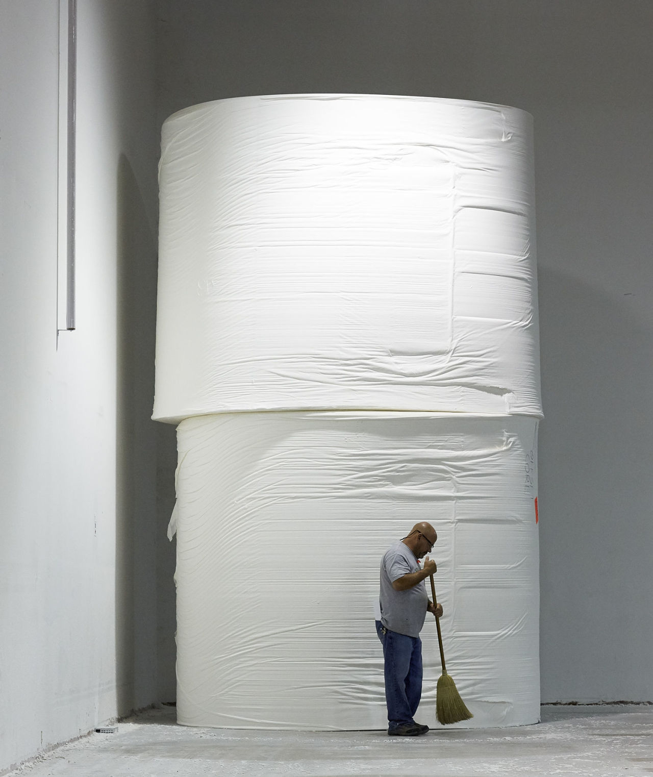 This is not a tiny man. Those are huge rolls of paper ready for repulping. Reed Young