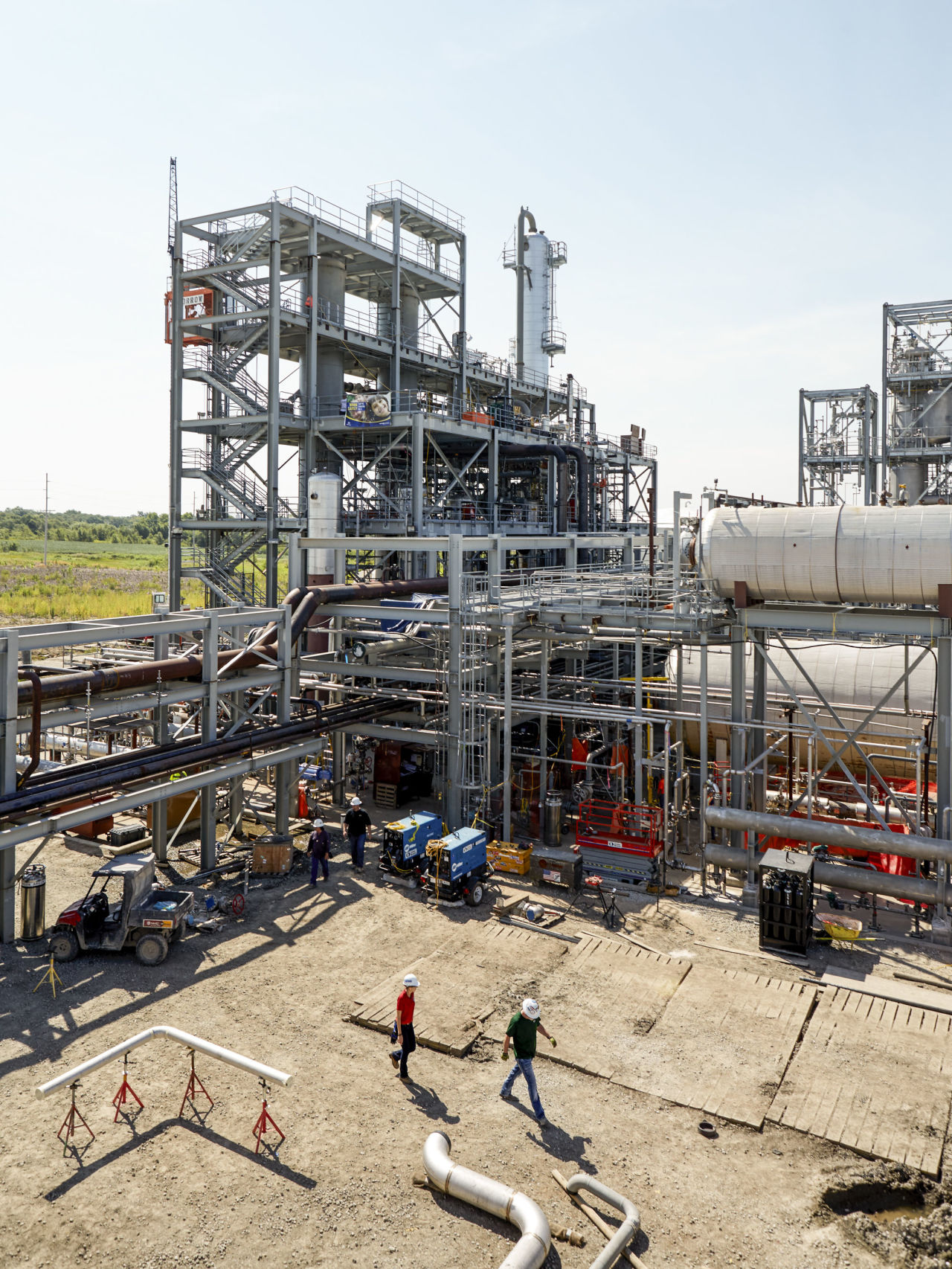 The place has come a long way since Flint Hills bought it. Michael Harris, one of the venture managers, says that at the time it looked like it was "straight out of a zombie movie." They set about adapting it for their purposes. The site itself looks like most processing plants, the kind of industrial complex you might pass daily and never think about. (Locals seem more excited about the number of jobs the plant will provide—fifty—than the significant innovations inside.) But the company says it's not just the multiple feedstock options that make this concept potentially world-changing. It's the final product. They say that the fuel it makes is cleaner, more efficient, and more versatile than any existing biodiesel. Those specifics, too, are well guarded, but Jeremy Bezdek, whose title at Flint Hills is managing director, innovation, puts it like this: "Most biodiesel looks like a nice, hoppy beer, maybe an IPA. Our product is pure, clean vodka."