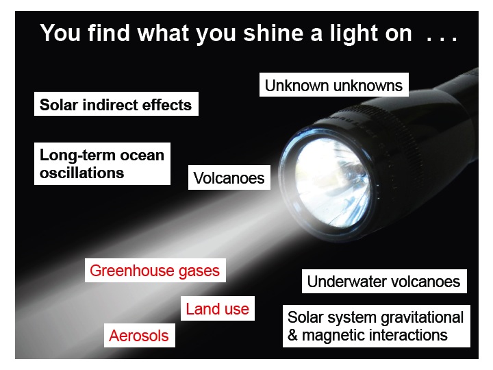 The flashlight in the illustration represents government funding announcements. Motivated by the relatively easy money of government grants, climate scientists flock to the bidders and bidders concentrate on the topics of concern to the government, most notably lately the alleged effects of the greenhouse gases emitted by humans. That is where the government shines the light, on the research objectives that qualify for grant funding. By connecting with the government’s enlightened social welfare policies and currying favor with the administrators of such, credentialed scientists can not only obtain comfortable stipends but earn legitimacy and public recognition. As Ben Franklin would have said, “They are doing well by doing good.”