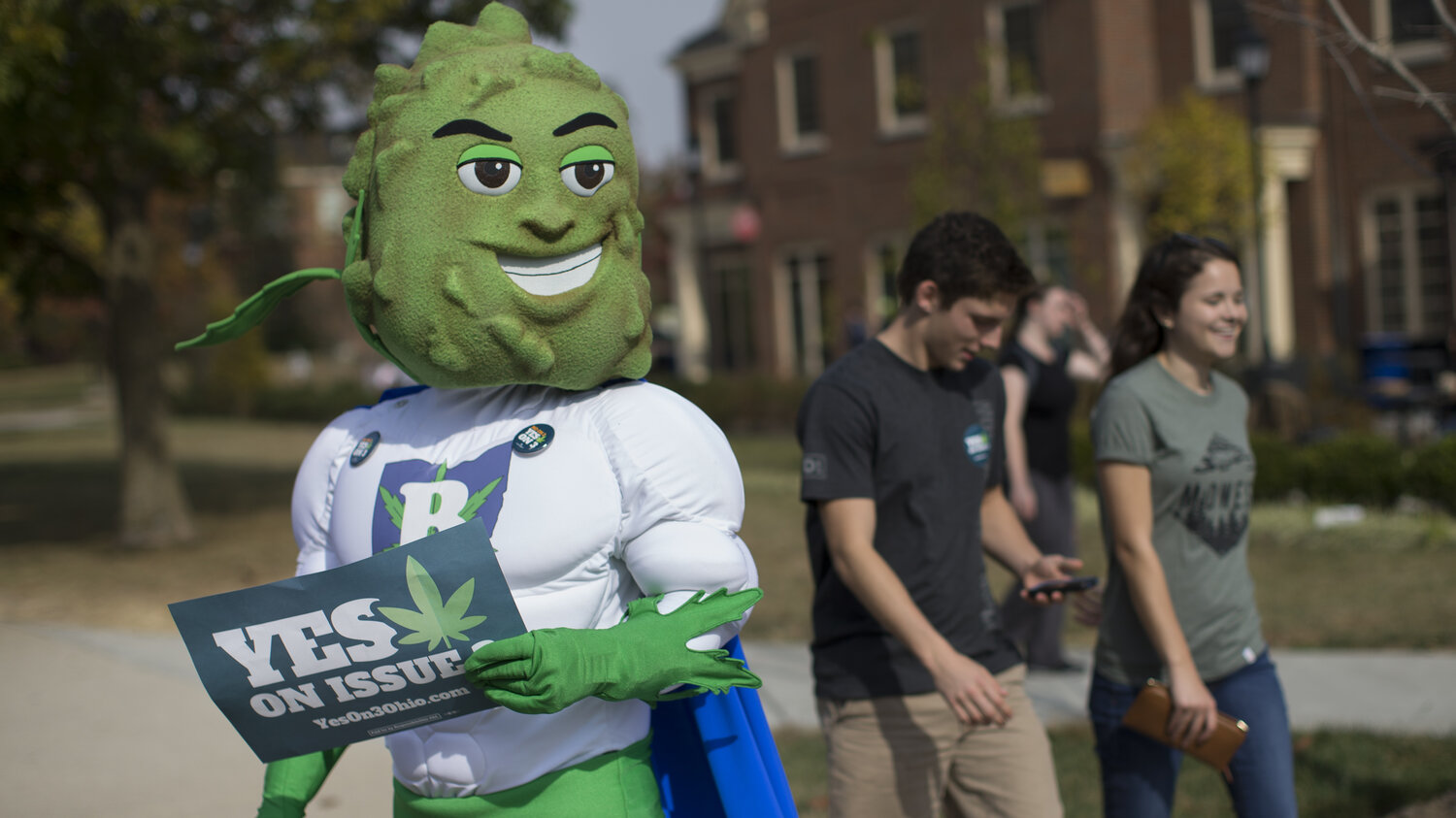 Buddie, the mascot for the pro-marijuana legalization group ResponsibleOhio, waits on a sidewalk to greet passing college students during a promotional tour at Miami University of Ohio last month.