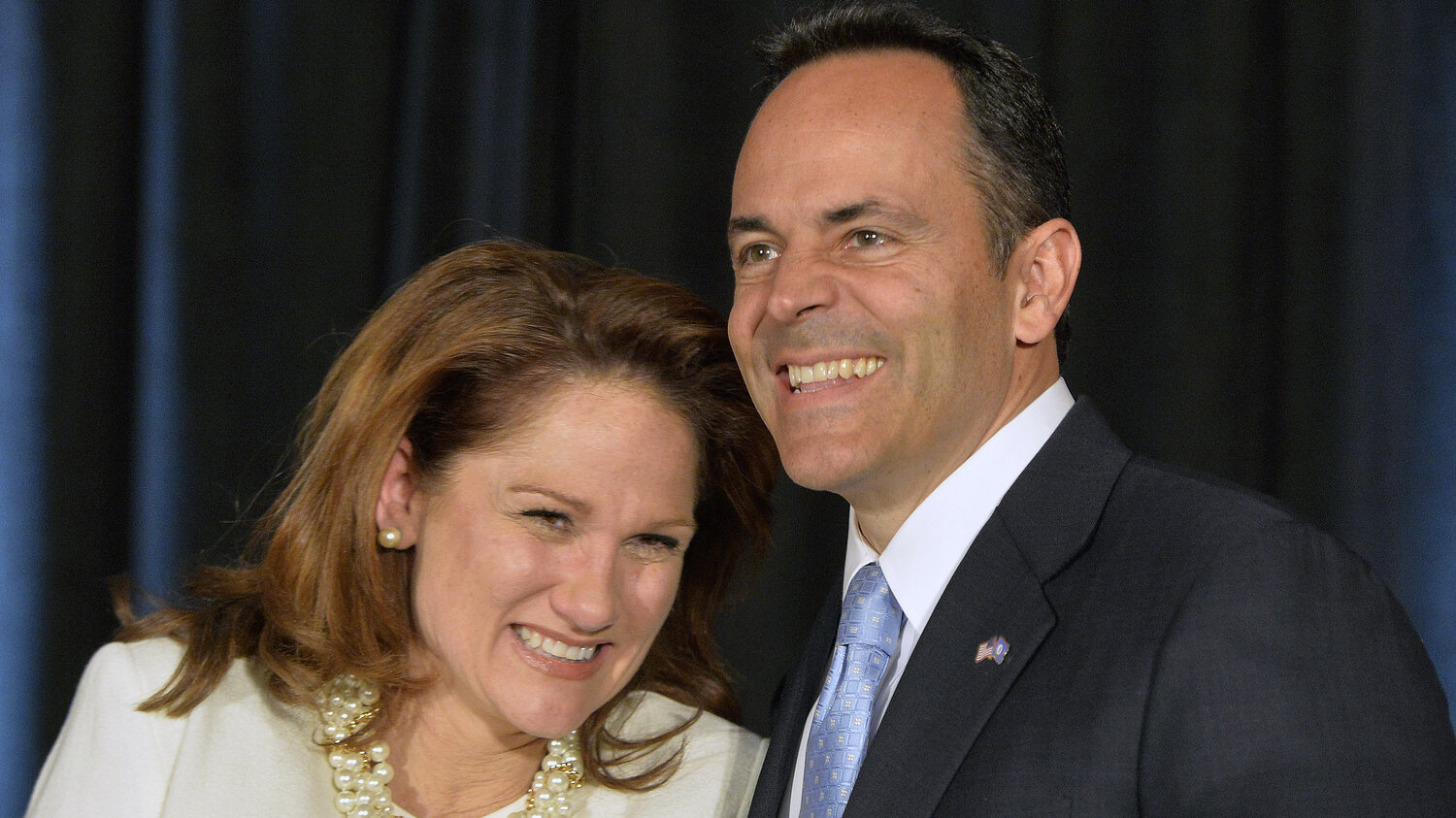 Kentucky Gov.-elect Matt Bevin and his wife, Glenna, react to the cheers of supporters during his introduction at the Republican Party victory celebration Tuesday.
