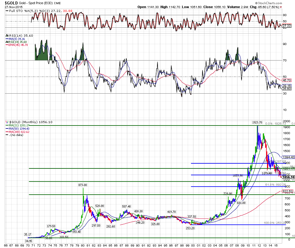 The Monthly Gold chart has taken out it's .618 retracement to the downside and I could see prices decline to $996 or even back to the .618 of the move from $253 to $1923 which would be $892 level and giving it several months to transpire... we could see the 200 Month Moving Average advance to converge at that $892 level
