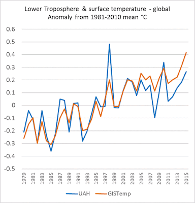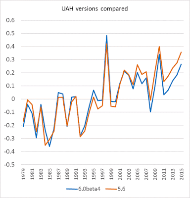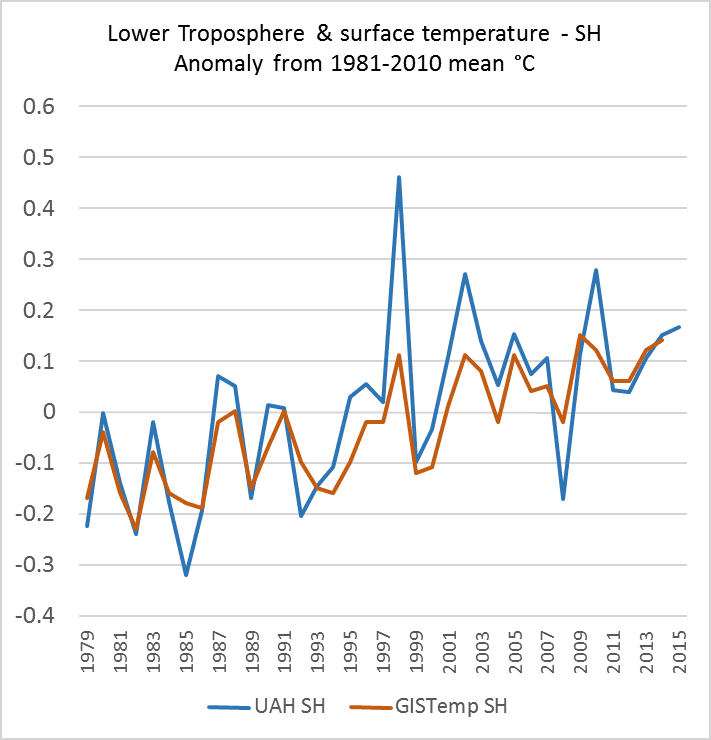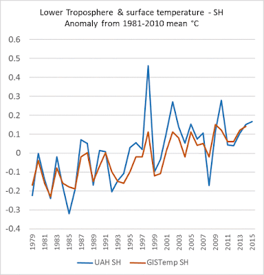 So I'd first look at the northern hemisphere to see if the divergence between the lower troposphere and the surface was real or was because of something odd in the satellite data. The difference could be real, the air above doesn't necessarily have to follow the exact same trend as the surface at the same time. Still, it's odd that it's only diverged in recent years, particularly in the northern hemisphere.Update: I nearly forgot to add this readme file to the article. It documents changes to the UAH datasets from 1999 up until March 2015 (just before version 6 beta was released).blog.hotwhopper.com