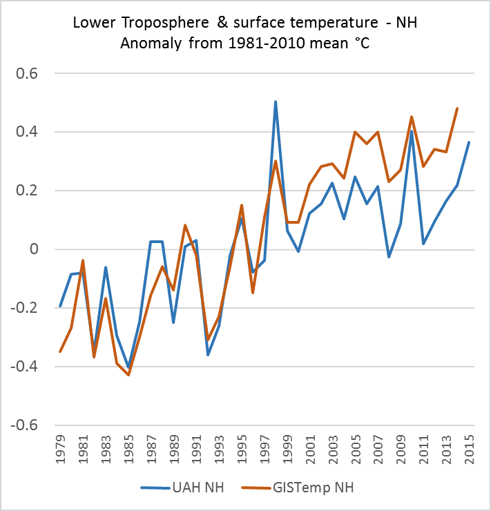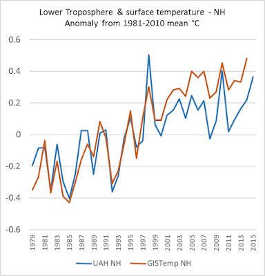Next a comparison of the northern hemisphere only. This time the divergence is even more marked, at around 2000/01. (The hemispheric GISTemp record is only available to 2014 at this time): Figure 4 | Lower troposphere and surface temperature - Northern Hemisphere. Data sources : UAH and GISS NASA
