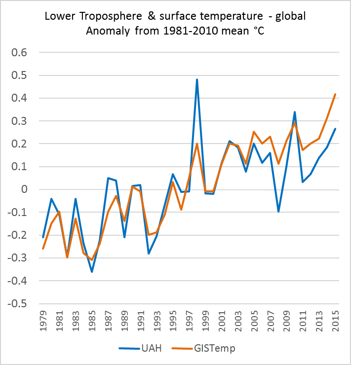 Next UAH beta version with GISTemp - global. You can clearly see that it diverges in the early 2000s. Figure 3 | Lower troposphere and surface temperature - global. Data sources : UAH and GISS NASA