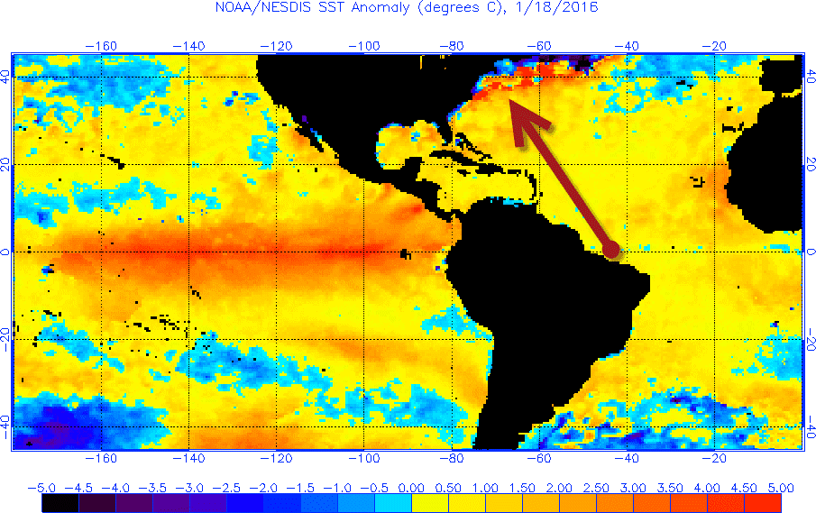 To: Brumar89 who wrote (916948 ) 1/25/2016 10:33:38 AM From: Wharf Rat Read Replies (2) | Respond to of 1574097 It's the snow not the cold, Eric Worrall Sou | 12:36 AM Eric Worrall takes over the reins of WUWT when Anthony is away, which has been a lot lately. Today he's shown that he doesn't understand the first thing about climate change. He wrote a short article with the headline: "If it is Hot, it is Climate, if it is Cold, its Climate ". What he's talking about is the stormy weather that hit the USA in the past few days, with crippling dumps of snow. As I speculated earlier, this was most probably fueled by the anomalously warm sea as seen in this image from NOAA . : Where Eric went wrong was that he thought that people were arguing that the AGW influence on the storm was in the cold. He's wrong. It gets cold in winter and, in any case, as far as I know it wasn't especially cold for the season. (I don't think temperature was mentioned in this timeline of the blizzard .) Eric's as bad as Anthony Watts at not understanding stuff he posts. He wrote :If it is Hot, it is Climate, if it is Cold, its Climate Remember all the recent press about the mild winter, how the bears were waking up early, flowers blooming in December, all a sign of the coming global warming apocalypse?Now that winter has turned cold and snowy, this is also being seen in some quarters, as irrefutable proof of our unnatural tampering with the balance of nature. It was the amount of snowfall that is likely to have been fueled by warm seas (compared to the long term average), which is the part that is probably affected by human activities. Eric has no excuse for getting it wrong. If he'd read the article he copied and pasted he'd have seen these words (my emphasis): ...according to actual scientists and not conspiracy-addled politicians, climate change could actually make snow storms worse . ThinkProgress spoke to Michael Mann, the nation’s preeminent climatologist, about Winter Storm Jonas, which is currently blanketing the eastern seaboard in feet of snow. He said this is not a fluke. “There is peer-reviewed science that now suggests that climate change will lead to more of these intense, blizzard-producing nor’easter,” according to Mann. This is because a warming climate means increased moisture in the atmosphere , and when cold air meets moisture — surprise! — it snows. Sometimes a lot, like we’re seeing right now.In fact the entire copy and paste was about how it's the increase in precipitation (not the temperature) that is linked to global warming. Eric is such a duffer. On a related note - what caused the warm patch that fueled Jonas? In case I don't get to finish an article I've started about the Atlantic Meridional Overturning Circulation, make sure you read the new article by Stefan Rahmstorf at realclimate.org. It's about the cold anomaly under Greenland (from melting ice), which may be contributing to a slowdown in AMOC, and could have been partly responsible for the anomalous warmth up the top of the Atlantic on the North American coast, which in turn fueled Jonas. As with every article Stefan writes, it's very informative and thought-provoking.blog.hotwhopper.com
