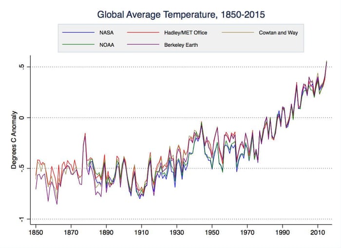 Various global surface temperature datasets, 1850–2015. Illustration: Zeke Hausfather