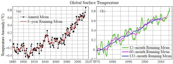 NASA GISS global surface temperatures. Right frame shows smoothing over various time periods. Illustration: James Hansen.