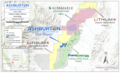 February 26th, 2016 ASHBURTON VENTURES INC. (ABR-TSX:V) (ARB-FRANKFURT) (“Ashburton” or the "Company”) announces it has increased its landholdings in Clayton Valley, Nevada. These new claims are contiguous to the existing ELON claims already held by Ashburton. Additionally, these claims border both Pure Energy Minerals Ltd. (PE-TSX:V) and Lithium-X Corp. (LIX-TSX:V) making the entire Elon project now enclosed between the two companies.