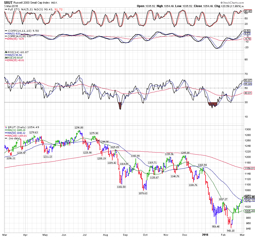 as has the RUT has climbed above it's 50 DMA.... on the strong rally yesterday ...This is coupled with the SPX, The NASD Comp and the NYA all vaulting above their 50 day MA yesterday....... to have 4 major indicies to all be giving the same bullish breakout signal on the same day is very rare to have them that closely coordianted and is absolutely bullish for them to all take out that resistance and close on their highs... above the intermediate term resistance. I suspect that we have not seen all 4 of those average climb from below their 50 DMA ; close above it and close on the high in the past 5 years.... although I have not researched that specific point.