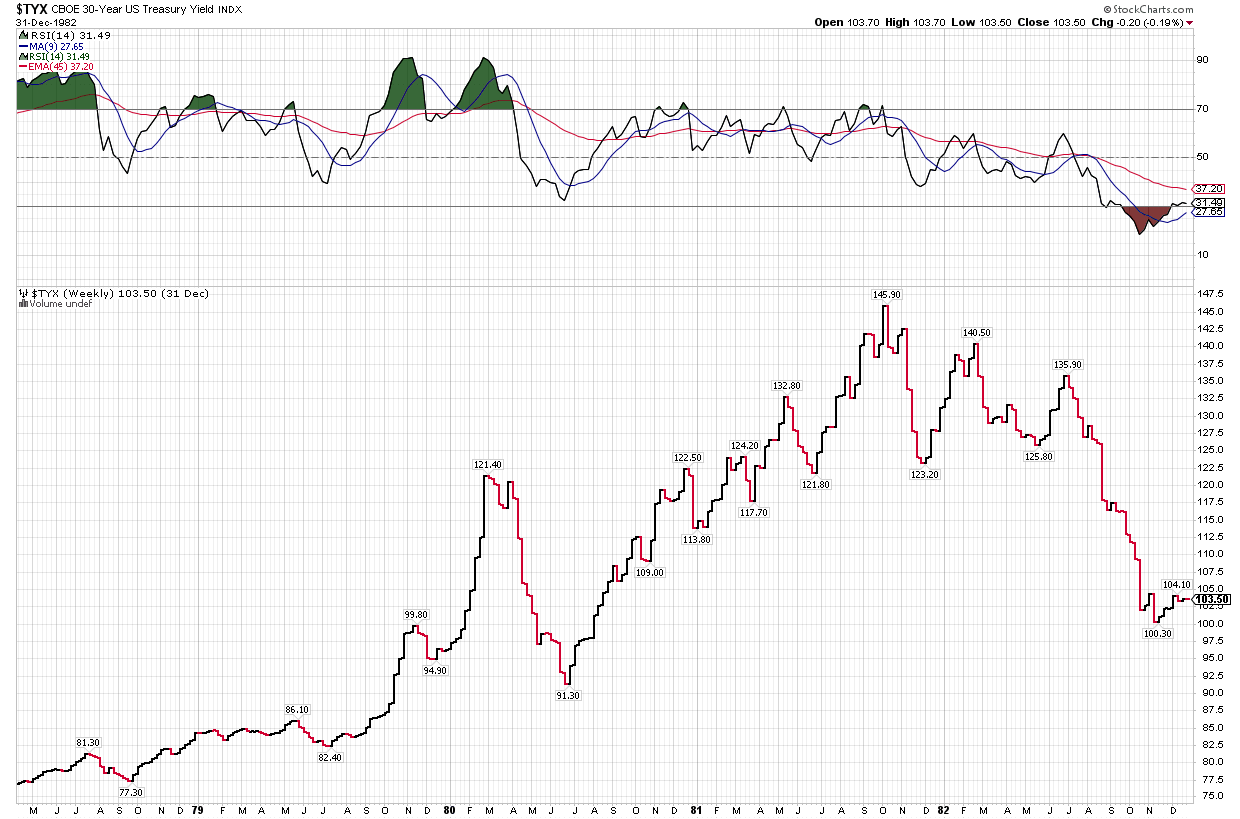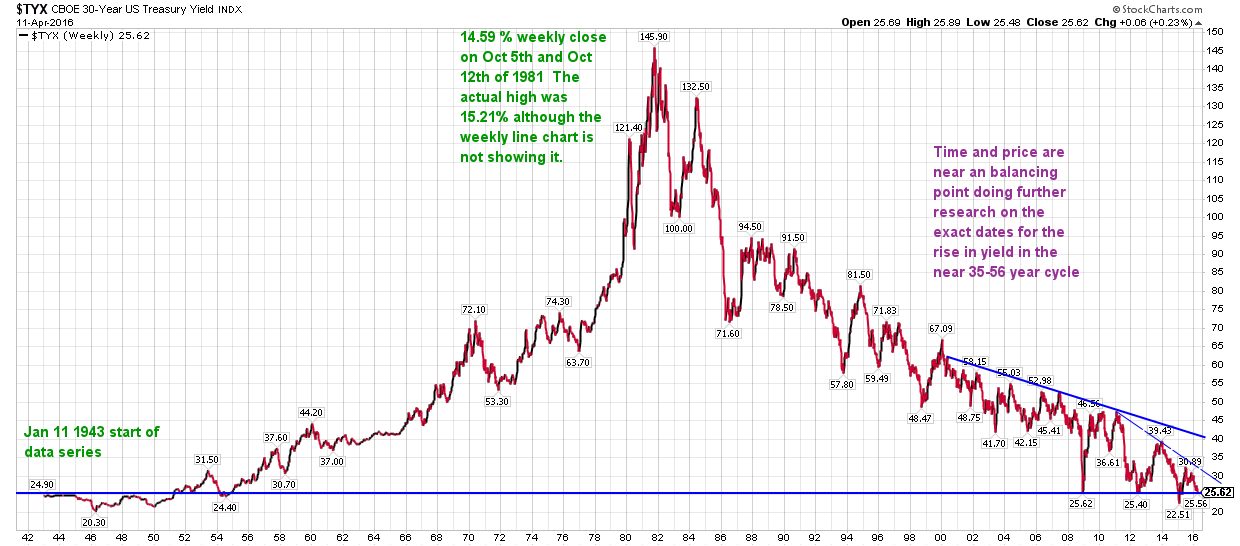 Here is a 75 year 30 year US Bond yield that I believe goes to the inception of the US 30 year bond.