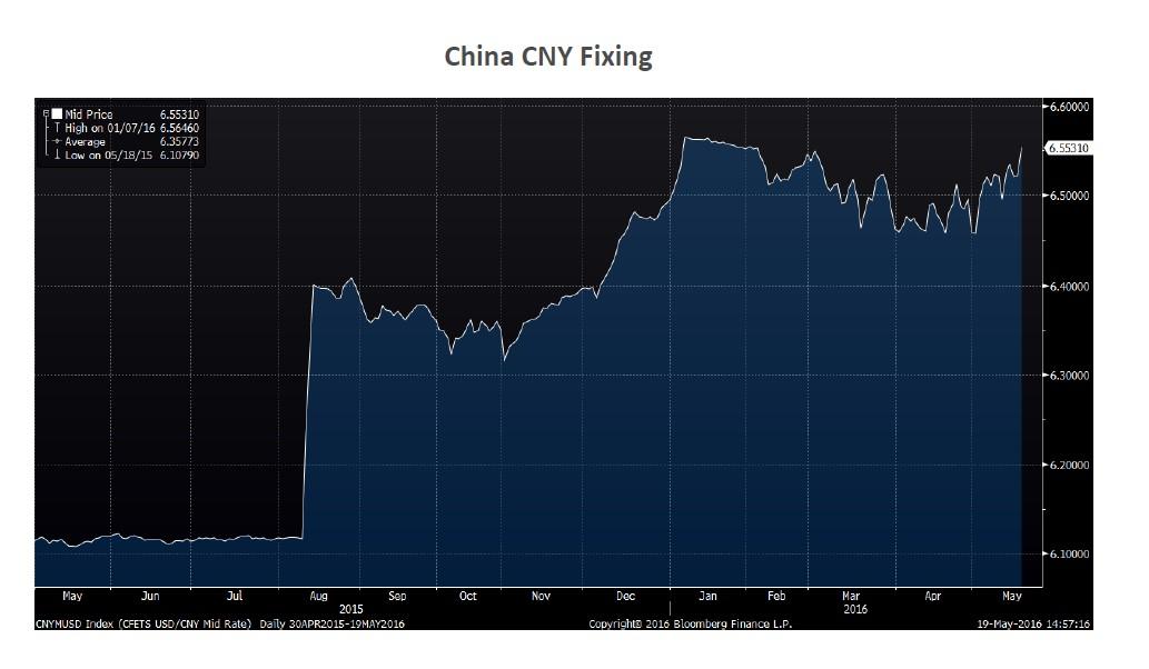 Source: DoubleLine, Bloomberg Dates: 04/30/2015 to 05/19/2016 CNY = Chinese Yuan Renminbi USD/CNY Mid Rate or the CNYMUSD Index is the daily CNY fixing price released by the China Foreign Exchange Trading System