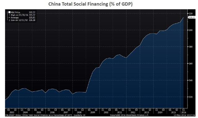 Source: DoubleLine, Bloomberg Dates: 12/31/2002 to 03/31/2016 China Total Social Financing or the CNLZFGDP Index: This ticker calculates total outstanding corporate and household borrowing in China as a percentage of GDP. To calculate outstanding corporate and household debt, it takes outstanding bank loans at end 2002 as a starting point and adds net growth in total social finance in every month since. Funds raised through equity issuance, which are included in total social finance, are netted out.