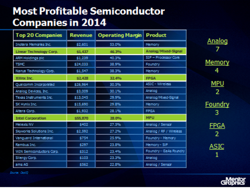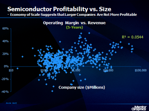 Read Replies (1) | Respond to of 67633 Blog Forces Driving Semi Mergers & AcquisitionsPart 2 in series Walden Rhines, Chairman & CEO, Mentor Graphics 6/8/2016 10:30 AM EDT 0 comments post a comment NO RATINGS LOGIN TO RATE inShare3The driving force for consolidation is typically the efficiencies achieved through economies of scale with larger volume. Not so with the semiconductor industry. As discussed in my last column , the semiconductor industry entered uncharted territory in 2015 with a wave of major mergers. After more than 60 years of deconsolidation, the industry made the first material steps toward consolidation. For many, this appears to be the inevitable maturation of an industry in which growth rates have slowed and further increases in return on investment depend upon the efficiencies of consolidation rather than upon growth. The driving force for consolidation is typically the efficiencies achieved through economies of scale with larger volume. In most industries, manufacturing economies of scale are the most important. This is true for the integrated device manufacturers, or IDMs, of the semiconductor industry as well. However, these IDMs constitute a continuously shrinking share of the semiconductor industry and now consist mostly of memory producers, several very large IDMs like Intel and Samsung, and process-differentiated companies that produce analog, mixed-signal, RF and power semiconductors. Thirty percent of the semiconductor industry is now fabless. Manufacturing economies of scale generated by the merger of fabless companies are limited (Figure 1). If two large semiconductor companies merge, the volume discounts they receive from the wafer foundries, as well as from the assembly and test subcontractors, are not greatly different. The additional volume achieved through merger likely adds only modest additional discounts. Figure 1 Click here for larger image Of course, manufacturing costs are only part of the volume-sensitive benefit of mergers. The cost benefits of a merger, often referred to as synergies, include many other types of economies of scale. One would expect to see a correlation of these cost benefits with size of semiconductor companies. What is remarkable is that such a correlation doesn’t appear to exist (Figure 2). Figure 2 Click here for larger image A look at data from the top 130 public semiconductor companies over a period of five years (Figure 2) shows no relationship between size and profitability. A linear regression coefficient of 0.0544 suggests no correlation at all. Comparison of the most profitable semiconductor companies seems to support this same conclusion (Figure 3). The largest semiconductor company, Intel, had a very respectable operating profit of 28% in 2014 on $56B of revenue. But Linear Technology, with only $1.4B of revenue achieved a 46.3% operating profit and Xilinx, with $2.4B of revenue, achieved a 32% operating profit. You might think that operating profit is dependent upon the sector in which a company operates but the top 20 most profitable companies in 2014 cover most of the range of possibilities — with analog (7), memory (4), microprocessor (2), foundry (3), FPGA (2) and ASIC (1). It appears that economies of scale are of limited importance in the motivation for consolidation. As a result, semiconductor companies rarely try to achieve the benefits of volume when a particular sector of the industry matures. We saw this in the wireless industry when most of the market share leaders in wireless baseband chips actually shut down their businesses rather than sell them as the market consolidated. TI was the leader in baseband chips and, like Broadcom, ST Micro, Marvell and more, found no buyers as the market commoditized. Others, like Qualcomm, HiSilicon, Mediatek and Spreadtrum showed a willingness to hang with it as prices declined. Even those who were able to sell what remained of their declining wireless chip businesses, like NXP, were not acquired by a consolidating leader. Figure 3 Click here for larger image Data seem to argue that the current consolidation of the semiconductor industry is not driven primarily by the desire to achieve economies of scale. In the next article (part 3 in the series), we’ll look at other motivating factors driving semiconductor mergers and acquisitions.Walden C. Rhines is Chairman and CEO of Mentor Graphics. His last article , "Semiconductor Merger Mania: A Change from Historical Norms," was published May 19, 2016.