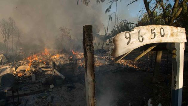 What's left of a home smolders as firefighters work to control flames in the town of Lower Lake, Calif. on Sunday, Aug. 14, 2016. (Josh Edelson)
