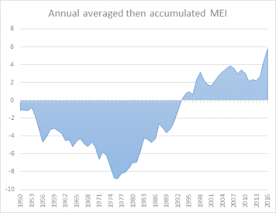 Figure 3 | The Christy and co "cumulative MEI". This seems to be calculated by first averaging all the MEI values over each calendar year, then accumulating the annual numbers.