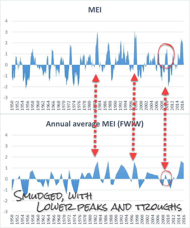 All values are normalized for each bimonthly season so that the 44 values from 1950 to 1993 have an average of zero and a standard deviation of "1".How or why anyone would distort the MEI into a cumulative chart is anyone's guess. But these chaps did. Not only did they do that, but the MEI is provided as a bi-monthly number. For each year it goes: Jan-Feb, Feb-Mar, Mar-April and so on to Nov-Dec. It took me a while to figure out what these authors did. I tried accumulating the values but ended up with values ranging from 64 to -110. That was an order of magnitude different to what these authors came up with. Turns out it was simple in the end.