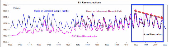 Here is the estimated and observed TSI according to resident WUWT solar expert, Leif Svalgaard. I've added a blue box to mark the period since the 1950, and an arrow to show that it's been declining: