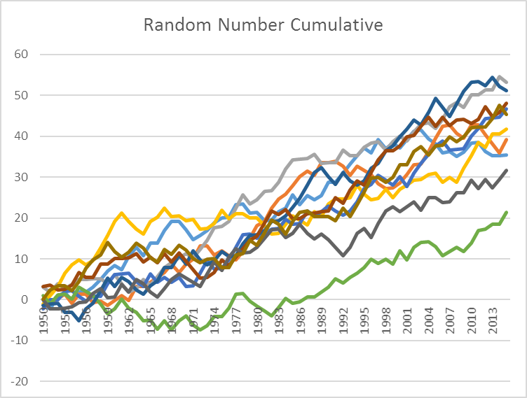 Here's something that John Christy and Joe D'Aleo and James P Wallace III could try. Instead of messing about with cumulative MEIs and TSIs, why not just use a random number generator? Below are ten plots that I generated successively (no cheating) with numbers that ended up between +3.3 and -2.3. I then performed the same calculations as they did to get the cumulative distribution.