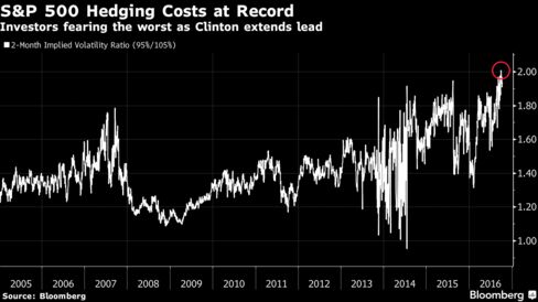 Even with Hillary Clinton taking her biggest lead in the polls since August versus Republican Donald Trump, the relative cost of hedging a 5 percent decline in an exchange-traded fund tracking the S&P 500 is twice the cost of betting on a gain, according to data compiled by Bloomberg. High readings in the indicator known as skew came even as the CBOE Volatility Index spent the previous three weeks trading below 14, on average.