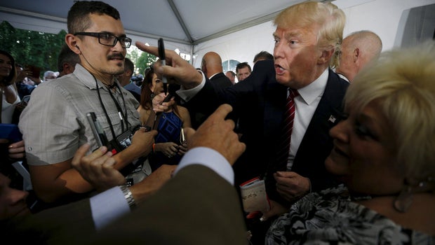 U.S. Republican presidential candidate Donald Trump points into the crowd after speaking to reporters at a campaign fundraiser at the home of car dealer Ernie Boch Jr. in Norwood, Massachusetts August 28, 2015.