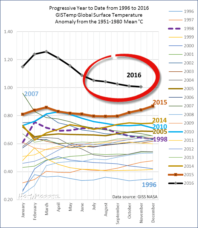 Figure 7 | Global mean surface temperature, progressive year to date to November 2016. Data source. GISS NASA