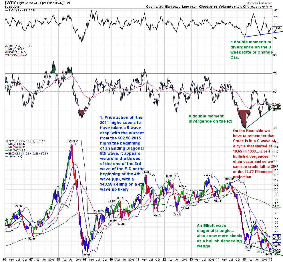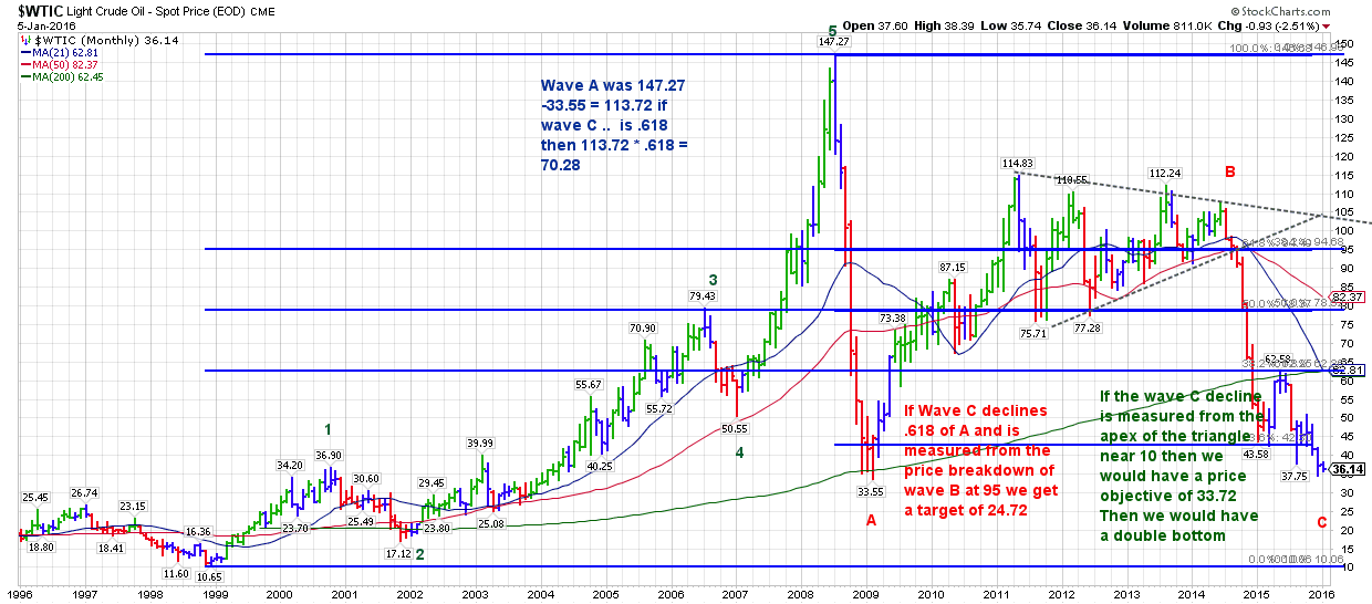 To: John Pitera who wrote (18531 ) 12/18/2016 4:22:49 PM From: John Pitera Respond to of 33421 To: Runomoâ„¢ who wrote (24964 ) 12/18/2016 3:50:16 PM From: John P of 24969 Hi Runomo, I basically agree with your analysis, I view it a little differently in that we had a textbook multi- year bull market in crude that began in 1999 and in Elliott wave terms a blow-off exponential top ending on July 2nd 2008, (which occurred in many assets classes) and in crude an 8 year A-B-C bear market and that ended in ultra bearish sentiment which is exactly what one should be looking for at the end of a vicious prolonged bear marketIMO because the breakdown last year from a well tested easy sloping long in duration trendline should have put the final nail in the death spiral coffin. Instead we have a return back and a potential recapture, on humongous volume, to the area of the long term breakdown implying whatever happened over the past year plus was most likely a false move coupled with dire negative sentiment "death spiral talk" the dire death spiral talk is the mass psychology that should exist when an asset class is totally out of favor. here are a couple of My simple not too "overthinking it - detailed" Elliott wave labeling. Message 30390841 To: The Ox who wrote (17536 ) 1/5/2016 9:19:59 PM From: John P 5 Recommendations Read Replies (1) of 18529Crude 20 Year Monthly, 10 year weekly and daily...... looks like the bear market is not over yet. But the weekly chart is showing some constructive and indications that a significant bounce is not that far away.... remember that is the weekly timeframe. The 20 year monthly Chart illustrates the Elliott wave Super Cycle Bull Market the began on Dec 21 1998 at $ 10.65 and topped out at $148 on July 2nd of 2008. The chart illustrates the fairly straight forward A-B-C corrective process that has been in place after the 10 year bull market.... at the end of such a huge Bear Market in Crude it is as tricky to catch the bottom as it is to determine exactly where a parabolic, exponentially rising market will top out. John This Monthly chart has the Elliott wave labeling of the Super Cycle and illustrates the Fibonacci price projections for the bottom .