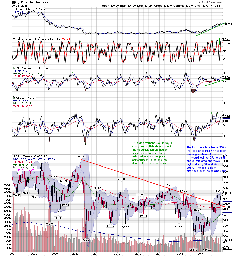 To: Jon Koplik who wrote (90 ) 12/20/2016 1:19:56 PM From: John Pitera Respond to of 127 HI Jon, this deal is quite bullish long term for BPL......The unique agreement spares BP of paying out cash and gives the capital of the United Arab Emirates' stake in a company that first arrived there in 1939, back when the country was still a British protectorate of sheikhdoms. The deal also makes the UAE one of the biggest single stockholders in BP as oil prices have climbed out of a 13-year low in February. "This agreement will provide BP with long-term access to significant and competitive resources that we already understand very well," BP CEO Bob Dudley said in a statement. News of the deal came without warning Saturday after years of negotiations between London-based BP and Abu Dhabi, the capital of the seven sheikhdoms that form the UAE. BP had held a 9.5-percent interest in the onshore concession that expired in late 2014. That year, the company's overall crude production dropped 2.4 percent, something it blamed in part on losing the Abu Dhabi concession. BP said Saturday's deal includes the UAE's Bab, Bu Hasa, Shah and Asab fields, which will produce between 20 billion to 30 billion barrels of oil equivalent over the 40-year term of the concession. BP will be entitled to 10 percent of its anticipated production of 1.66 million barrels of oil per day under the deal. The 10 year British Petroleum chart has a number of bullish developments as it nudges up to a multiyear horizontal resistance area that it appears to be preparing to break out above. Especially bullish is the Accumulation/Distribution line, The very powerful price momentum on the Oscilators and The RSI MA model is in buy mode and the Money Flow is also in buy mode. Positive fundamental catalysts such as this deal can only help. JP