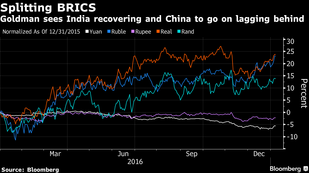 To: ggersh who wrote (127755 ) 1/5/2017 10:02:31 PM From: elmatador Read Replies (1) | Respond to of 217615 Goldman’s Bet on Emerging Currencies Is BRICS Without the ‘C’ January 6, 2017, 5:07 AM GMT+4 Favors countries less vulnerable to U.S. protectionism Bet against yuan when China worries are ‘off radar screens’ Goldman Sachs Group Inc., home to the team that conceived the BRIC framework for investing in the largest emerging markets, is urging investors to "stay the course" with bets on the currencies of Brazil, Russia and India, along with South Africa. When it comes to China, Goldman anticipates a “grinding” move lower for the yuan this year, “analogous to 2016.” Goldman emerging-market strategists led by Kamakshya Trivedi in London predicted in a note dated Thursday the yuan will retreat to 7.3 per dollar by year-end, more bearish than the 7.16 median forecast in a Bloomberg survey. It was at 6.883 on Thursday in Beijing. China, South Korea and other Asian economies are vulnerable to U.S. President-elect Donald Trump’s protectionist election manifesto translating into policy and regulatory action. By contrast, Brazil, Russia, India and South Africa are less at risk, Goldman analysts reckon. “Mapping U.S. ‘swing state’ job losses with emerging-market-U.S. trade flows suggests that these ‘good carry’ candidates appear less likely to face U.S. import restrictions because their exports compete less directly with U.S. labor,” the Goldman analysts wrote. The analysts cited improving balance of payments, falling paths for inflation, attractive real yields and prospects for stronger growth this year in the four big emerging markets they favor. “Preferred emerging-market longs can be funded out of non-Japan Asia low-yielders (South Korean won, Singapore dollar, Malaysian ringgit) or in non-dollar developed markets (euro, yen, pound),” they wrote. China’s yuan could potentially fall further than 7.3 per dollar by year-end, Goldman said. Accelerated capital outflows, or depreciation carried out as a policy response to Trump protectionism, are among the risk scenarios. “The best times to gain exposure to dollar-yuan weakness have tended to be when China concerns were off radar screens, or after periodic interventions that flushed out bearish speculative positions and provided attractive entry points,” the Goldman analysts wrote. “That remains our view today.”