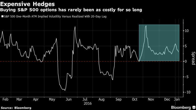 To: John Pitera who wrote (89595 ) 2/8/2017 11:12:08 AM From: John Pitera Respond to of 222362 Low VIX Masks Insurance Markup Options Traders Are Paying by Cecile Vannucci February 8, 2017, 5:17 AM EST February 8, 2017, 8:39 AM EST Here’s another sign that beneath the surface of placid stock markets, investors aren’t exactly sound asleep. It’s the persistently high premium traders are paying for equity options, visible in the difference between implied and realized volatility in the S&P 500 Index. The gap, definable as the intangible cost of stock insurance over and above what is accounted for by the market’s swings, has now lingered for 51 trading days. That’s the longest streak in almost a year and one of the longest in the past decade, data compiled by Bloomberg show. Implied volatility has exceeded realized by 3.9 points on average each day since October, about 12 times the average gap over the past decade. “This chart illustrates two ‘alternative facts’ that have been thrown around a lot lately,” said Patrick Hennessy, head trader for the $88 million IPS Strategic Capital Absolute Return Fund in Denver. The fund trades primarily options on the S&P 500 and CBOE Volatility Index. “The first is that options are cheap. The second is that low volatility means that there will soon be a spike in volatility. Yes, volatility is a mean-reverting asset, but that does not necessarily indicate that it will immediately pop higher. ” In the last 10 years, the longest run of S&P 500 implied volatility trading above realized swings lasted 81 days through March 2012. The VIX rallied 43 percent in the following two months as the S&P 500 slumped, reaching a low in June of that year. In other occasions when volatility bets were above actual price fluctuations for more than 51 days, the VIX fell in four of the six instances. Last year, it jumped ahead the British vote to leave the European Union. IMPL. VOL BELOW REALIZED FOR:STEAK ENDED:VIX MOVE IN NEXT TWO MONTHS:51 days 1/6/2017 N/A 56 days 4/22/2016 60% 52 days 9/19/2012 9.8% 81 days 3/14/2012 43% 58 days 2/1/2011 -1.3% 60 days 11/3/2010 -10% 71 days 10/8/2009 -2% 70 days 6/26/2009 -3.8%