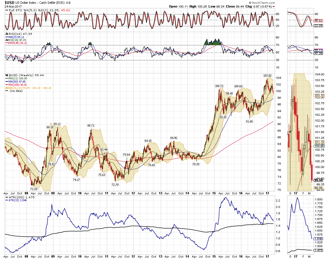 On The 10 year Weekly chart the USD has been above the Bollinger band 3 times this past fall on the USD rise and has not done anything to counteract that longer term bullish action. I also construe as bullish the longer term 200 week ATR being above the shorter term 13 week ATR.