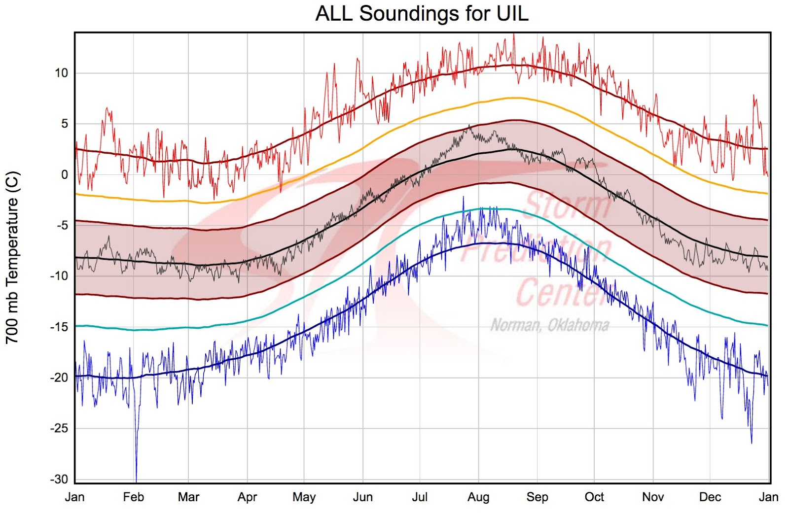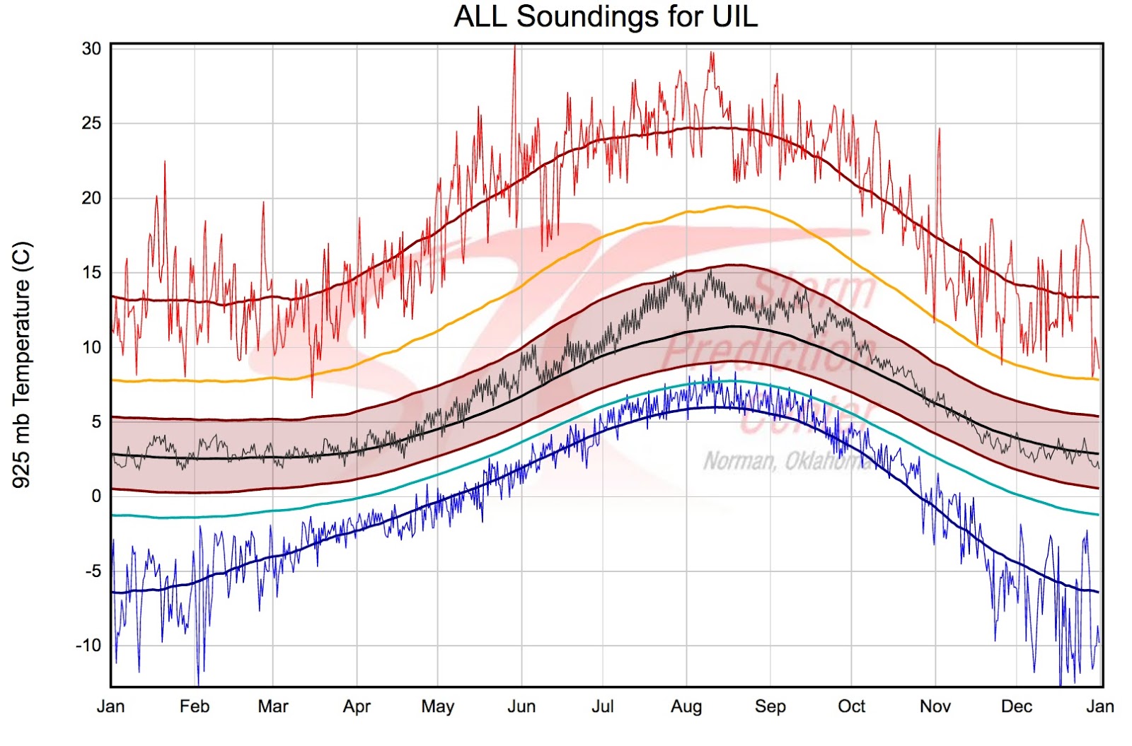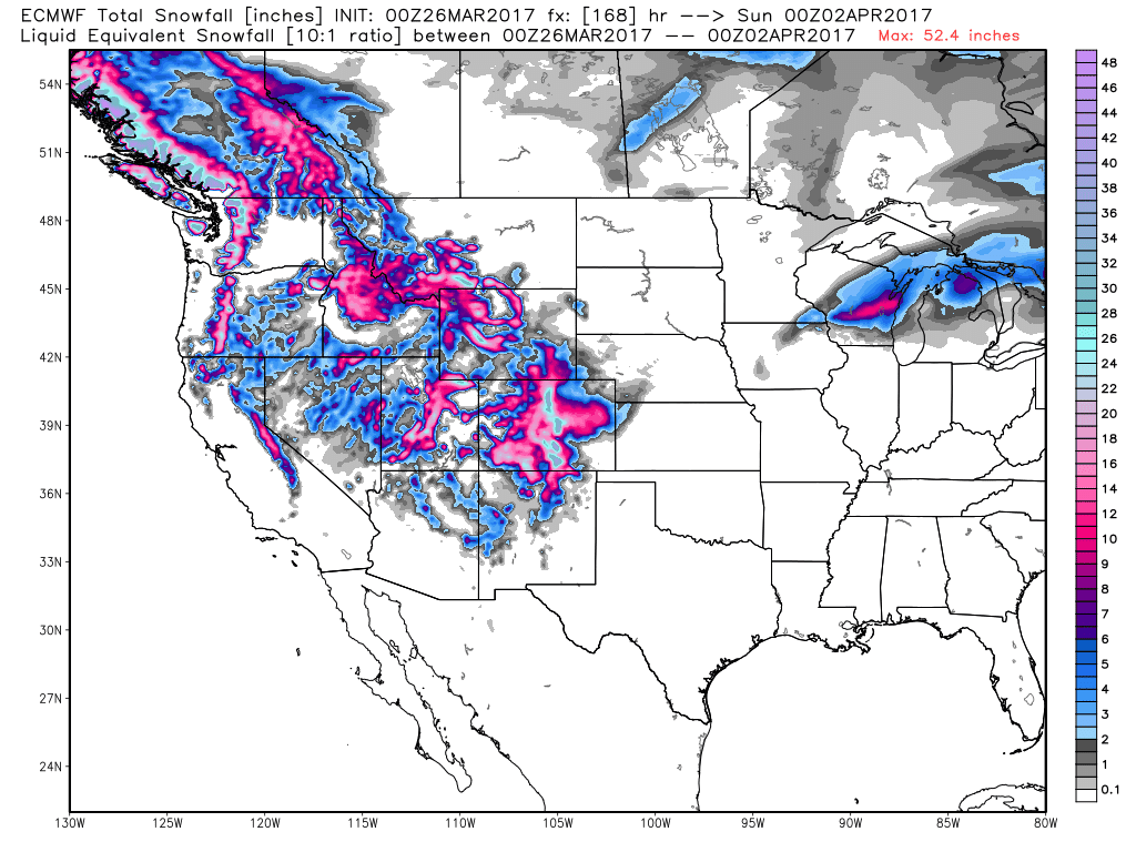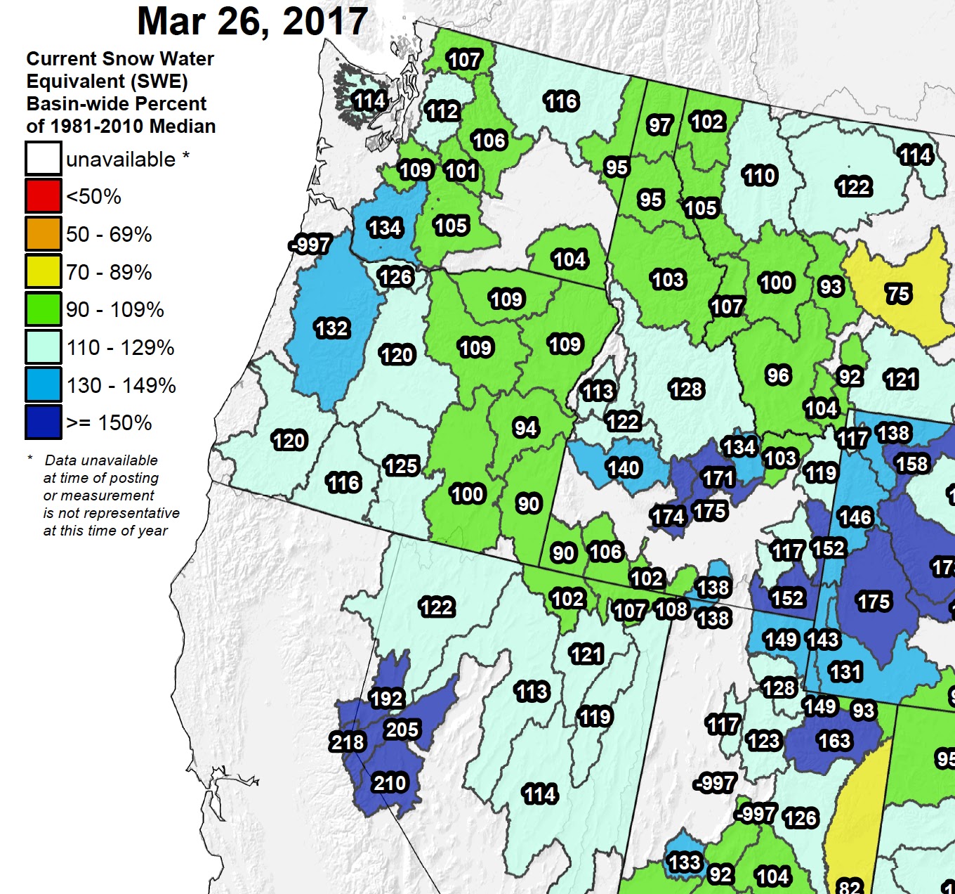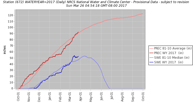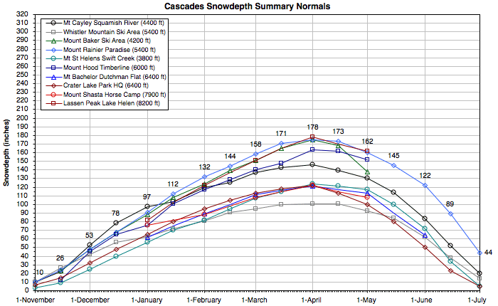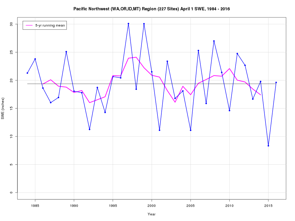 To: Brumar89 who wrote (75736 ) 3/27/2017 2:09:06 PM From: Eric Respond to of 86356 Cliff Mass Weather Blog This blog provides updated forecasts and comments on current weather or other topics Sunday March 25, 2017Peak Snowpack Time Historically, the snowpack over the Pacific Northwest mountains peaks right about now--the last days of March to first week in April--something that is illustrated by the figure below (a figure from Amar Andalkar's wonderful skiing the Cascade volcanoes site ). This year the regional mountain snowpack surged in early March, but has stagnated the last week or so because of warmer weather, something illustrated by the snowpack numbers at the Olallie Meadows SNOTEL site near Snoqualmie Pass (dark blue is this year's snow water equvalent, SW), light blue is normal. Why does our snowpack hit its maximum around April 1, a time when the sun is getting quite strong (equivalent to mid-September)? Before we talk about that, here are the latest snowpack numbers (percent of normal) around the West. Virtually all the West is well above normal for SWE (total amount of water in the snowpack), with California's Sierra Nevada being crazy high. As noted by Mark Albright, past state climatologist, with 720 inches of snowfall through 23 March, Mt Baker Ski Area has recorded its snowiest winter since the big snow years of 2011-12 with 808 inches and 2010-11 with 857 inches. This is going to be a long ski season for the Northwest. Enough snow that Washington DOT is delaying its clearing of North Cascades Highway (SR20); according to WA DOT it may be the latest opening since 1974. This WSDOT photo of SR 20 near Liberty Bell mountain shows some of the challenges, including several avalanche shoots. So why does Cascade snowpack peak around April 1? It is all about temperature . Since our weather systems come off the Pacific, it is good to look at the vertical sounding at Qullayute, on the NW WA coast. Below are the climatologies of temperature there for three levels (925 hPa--around 2500 ft, 850 hPa--around 5000 ft, and 700 hPa--around 10,000 ft). Those levels pretty much bracket the Northwest high terrain. You will notice that they have a similar characteristic: temperatures aloft don't start warming until mid-April. I talked about that in a previous blog---the atmosphere has a lot of thermal inertia, which means it takes a while for the increasing warming at the surface to influence the deeper atmosphere. So with temperatures remain cool and precipitation still hitting our region, snow accumulation can continue into early April. And there is another issue, snow is highly reflective, so a lot of the sun over the mountains is reflected to space rather warm the surface. This is an issue regarding our regional impacts of global warming. As the earth warms, our mountain snowpack will lessen, which will allow more solar radiation to be absorbed, which causes more warming and thus melted snow. A positive feedback for destroying snow and warming our region. Those effects will become profound later in the century, but so far there have been only minimal losses of Cascade snowpack. Larry Schick of the US Army Corps of Engineers, also known as the Grand Poobah of NW Powder, sent me some snow statistics of major regional ski areas provided by Tony Crocker (his best snow web site has lots of good material). Both the Pacific Northwest and California ski areas show little trend (black line) through 2013. And an analysis of snow water equivalent (SWE) of over 200 SNOTEL sites around the NW through 2016 by Mark Albright suggests little trend over the past 30 years (see below) Now before some folks get irritated with me, let me underline that this will all change by mid-century as greenhouse gases increases. We have been "protected" by the slow to warm eastern Pacific. but eventually the radiative effects of increasing greenhouse gases will warm the lower atmosphere even here causing substantially reduce snowpack. Finally, what about the next week? The latest ECMWF snow forecast shows some additional snow at higher elevations across our region. Enjoy. Posted by Cliff Mass at 7:21 AM cliffmass.blogspot.com