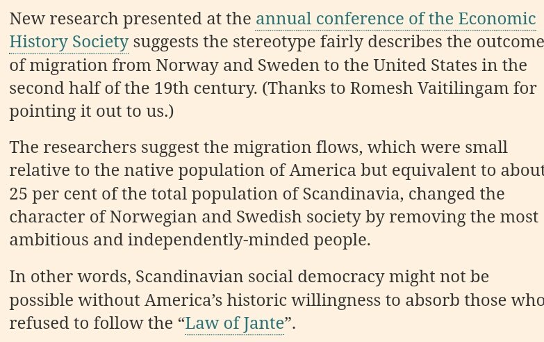 To: Brumar89 who wrote (1009080 ) 3/31/2017 2:29:38 PM From: Brumar89 Read Replies (1) | Respond to of 1573841 "How America made Scandinavian social democracy possible" ftalphaville.ft.com How America made Scandinavian social democracy possible YESTERDAY By: Matthew C Klein Change enough of the people in a society and you end up with different one. If everyone in Mexico (about 130 million people) moved to Texas (current population: about 28 million people) tomorrow, it would be reasonable to imagine that life in Texas would become somewhat more like life in Mexico is today. Migration waves of that scale and concentration are quite rare, of course. More common is for relatively small groups to move from one place to another, with the adventurous leavers generally quite different in temperament and ability than those who stay behind. Rather than transferring their native societies’ virtues and vices wholesale, these migrants bring with them a far more individualistic version of their culture than wherever they came from. Hence the not-unreasonable stereotype that places largely populated by voluntary migrants and their descendants — such as the United States — are more entrepreneurial, wealthier, and more unequal than source countries, such as Europe. New research presented at the annual conference of the Economic History Society suggests the stereotype fairly describes the outcome of migration from Norway and Sweden to the United States in the second half of the 19th century. (Thanks to Romesh Vaitilingam for pointing it out to us.) The researchers suggest the migration flows, which were small relative to the native population of America but equivalent to about 25 per cent of the total population of Scandinavia, changed the character of Norwegian and Swedish society by removing the most ambitious and independently-minded people. In other words, Scandinavian social democracy might not be possible without America’s historic willingness to absorb those who refused to follow the “ Law of Jante ”.en.wikipedia.org The methodology centres on names. Psychologists have long found that people with relatively rare names are more likely to be “unique”, presumably because parents who consciously choose rare names for their children would be more likely to raise them to be nonconformists. The researchers have access to all the names of people who lived in Norway and Sweden throughout the great migration wave, as well as all the names of the people who left for America. They also have the same information broken down by locality for a more fine-grained analysis. They found that while “individualism” rose modestly overall, the places with more emigration became relatively more “collectivist” than those regions with less emigraton. Here’s a simple version: This wasn’t just a coincidence. Focusing on the people who actually left Norway and Sweden for America, it turns out they were much more likely to have “unusual” names for their region than those who remained in Scandinavia. As the authors conclude: Individualistic types are more prone to migrate as they feel less attached to their surrounding social environment. In the sending population, this self-selection generates a push towards collectivism. Had it not been for America’s willingness to embrace enterprising nonconformist Scandinavians, “individualism” in Norway and Sweden would have been much greater and their particularly successful form of social democracy might never have been able to take root. This presents interesting questions for policy. If you want a highly individualistic society, with all the benefits and pitfalls that entails, you should want large-scale immigration, particularly from places that are far away. If you prefer more tight-knit communities and a large welfare state, you might prefer to avoid taking in ambitious nonconformists from abroad and instead try to get your own “troublemakers” to leave. Perhaps it’s no coincidence that America’s greatest period of social conformity and social democracy occurred when immigration was essentially zero. Similarly, you have to wonder about the connection between the strength of anti-immigrant parties in Scandinavia — part of the ruling coalitions in Finland and Norway , propping up the minority government in Denmark — and the strength of their social market tradition. ( Sweden seems to have fared somewhat differently but even there, the anti-immigrant party is one of the largest in parliament.) The UK might be the most striking case. In the decades since Thatcher claimed “there is no such thing as society”, the composition of the UK population has changed markedly thanks to a large wave of immigration. The boom in inflows can only be partly explained by migration from southern and eastern Europe enabled by common EU membership. Regardless of the cause, over the same period, the UK became both far richer and far more unequal than it had been before. It’s not inconceivable to believe the victory of the campaign to leave the European Union, with its heavy focus on the supposed costs of immigration, was a backlash to the rise of individualism by a collectivist rearguard as much as anything else. Whether this resurgent collectivism will make the median Briton any better off is less clear.ftalphaville.ft.com
