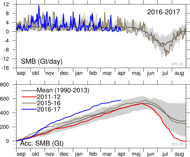 Interestingly, however, the Danish Meteorological Institute estimates that the Greenland ice sheet has gained considerably more mass than usual so far this cold season. This was probably caused by the unusual North Atlantic circulation pattern, as low pressure and storminess have been more dominant than usual near southern Greenland.