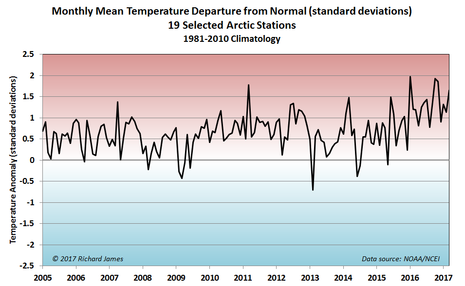 If we look at the temperature in terms of standard deviations away from normal, the warmth really hasn't taken a break since the remarkable events of January 2016. Monthly mean temperatures now seem to be remaining near levels that were very unusual only a few years ago.