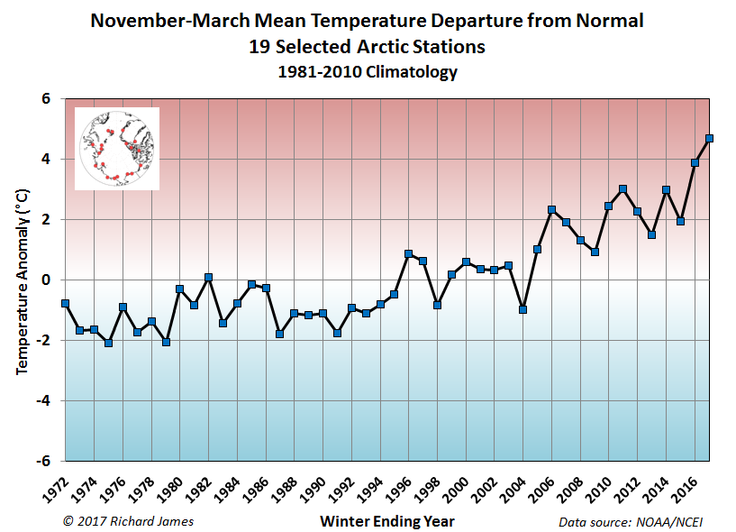This winter's November-March average temperature was the highest since at least 1971 for the 19 stations, as shown in the chart below. Remarkably, Vize Island (on the northern side of the Kara Sea) was more than 10°C above normal for the 5-month average. To get a sense of how enormous this anomaly is, consider that 10°C is greater than the difference between the record coldest and record warmest November-March periods in Fairbanks.