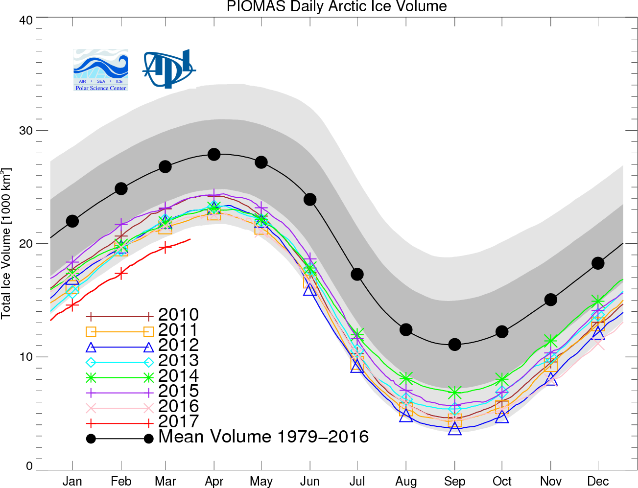 Not surprisingly, March average Arctic sea ice extent was the lowest in the satellite era according to the NSIDC, and estimated sea ice volume is also well below previous records.