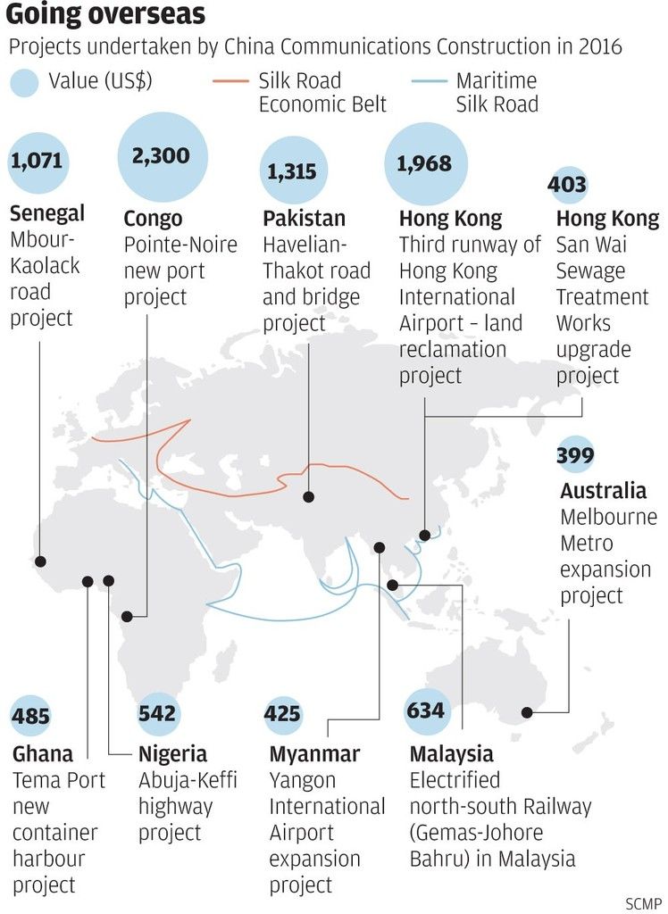 In 2016 alone, Chinese firms signed new construction projects worth a total contractual value of US$126 billion. CCCC accounted for one-tenth, or US$12.6 billion of the projects.
