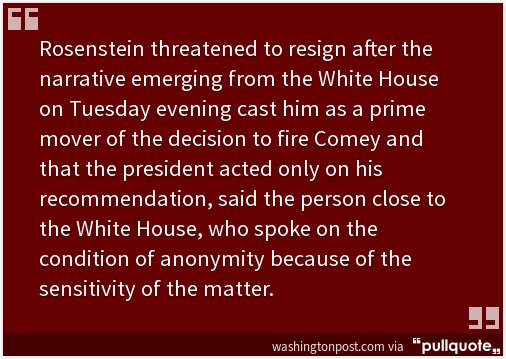 Trumpov ordered Sessions, who passed on the order, to come up with justifications to fire Comey. Then he hid behind the product pretending he was responding to requests from Justice. Today, Trumpov admitted he intended to fire Comey anyway, it was his decision.