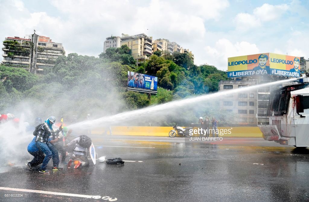 Pro-socialist partygoers on hot streets of Caracas are treated with delightful cooling showers from benevolent Venezuela police.