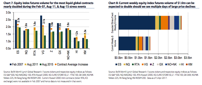 Further, as we’ve noted in the past, equity futures market liquidity is not only measured by total volume but also market depth which in recent risk-off events has declined in times of vol shocks. The greater the selling pressure that is concentrated in a shorter time period against falling market depth (when liquidity is needed most) could also further exacerbate market shocks.