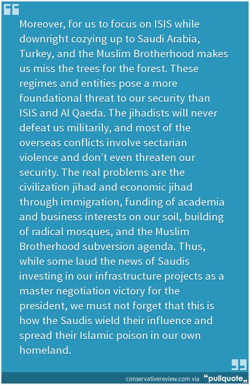 Our immigration law already vets for ties to terrorism. In his “principled realism” speech, however, the president takes the position that we’re only concerned about violence. “We are not here to lecture — we are not here to tell other people how to live, what to do,” he says. Our “goal is . . . to conquer extremism” — a term the president narrows to mean terrorism — lest he insult his “gracious hosts.” If you are myopically focused on terrorism, however, you are missing most of the challenge posed by sharia encroachment. Jihadist terror is not pointless; its purpose is to impose sharia — a version of it similar to what the Saudis enforce. The president is up in a balloon because, as he explained in his speech, he has “signed historic agreements with the Kingdom that will invest almost $400 billion in our two countries and create many thousands of jobs in America and Saudi Arabia.” Perhaps his strategists could inform the president that when Saudi Arabia invests in America, the result invariably includes the construction of schools and mosques that propagate the ideology that causes the State Department to issue the travel guidance outlined above. (See, e.g., my 2010 profile of the Dar al-Hijra mosque in Virginia.)