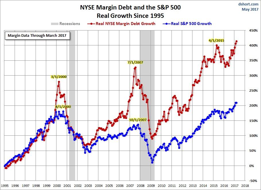 In any case, there is little evidence that the growth in margin debt is the result of QE. In fact, we see margin debt growth in 2016 and 2017, long after QE is over and during the Fed's period of tightening monetary policy: