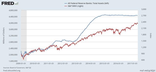 While the Fed hasn't purchased U.S. stocks, the argument I commonly come across from permabears is that QE distorted the market by causing funds to flow into equities that would've otherwise gone elsewhere. Thus while not buying stocks directly, the Fed effectively caused the stock market to go up. The chart invariably used to make this argument is one comparing the Fed's assets to the S&P 500: