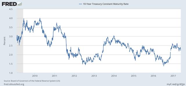 This is a chart of the maturity rate paid on 10-year U.S. Treasuries. Remember that interest rates and prices are inversely related on bonds, so when this line goes up the price goes down and vice versa. Here we see the line trending slightly lower, but the change is very slight.