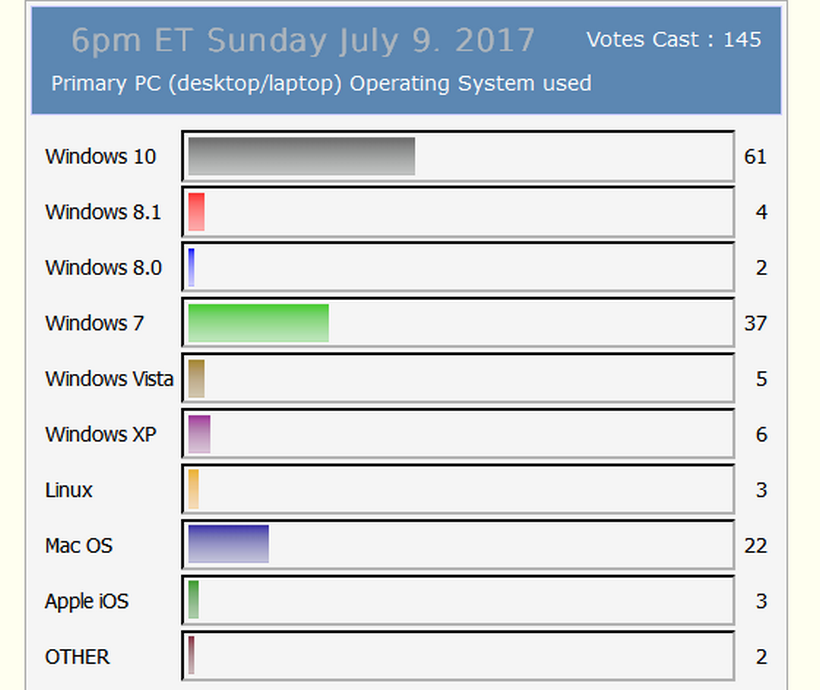 Thanks very much Josh for creating the Desktop/Laptop Operating System Poll and expanding it beyond the borders of just this SI board. Now edging close to 150 total inputs is pretty darned good participation. While there are undoubtedly some inputs cast from outside North America there are probably not all that many. At a quick glance the percentage results appear to jibe pretty well with StatCounter's OS shares for North America.