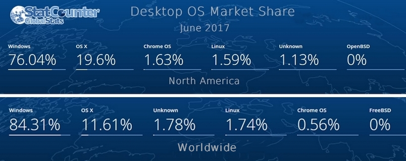 June 2017 Global & North American Desktop OS Market Share: (StatCounter) ...